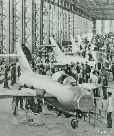 1956年7月19日,國產(chǎn)第一架噴氣式戰(zhàn)斗機在沈陽首次試飛成功,標志著中國具備了獨立研制空軍武器裝備的能力。圖為國產(chǎn)第一批噴氣式飛機即將出廠。